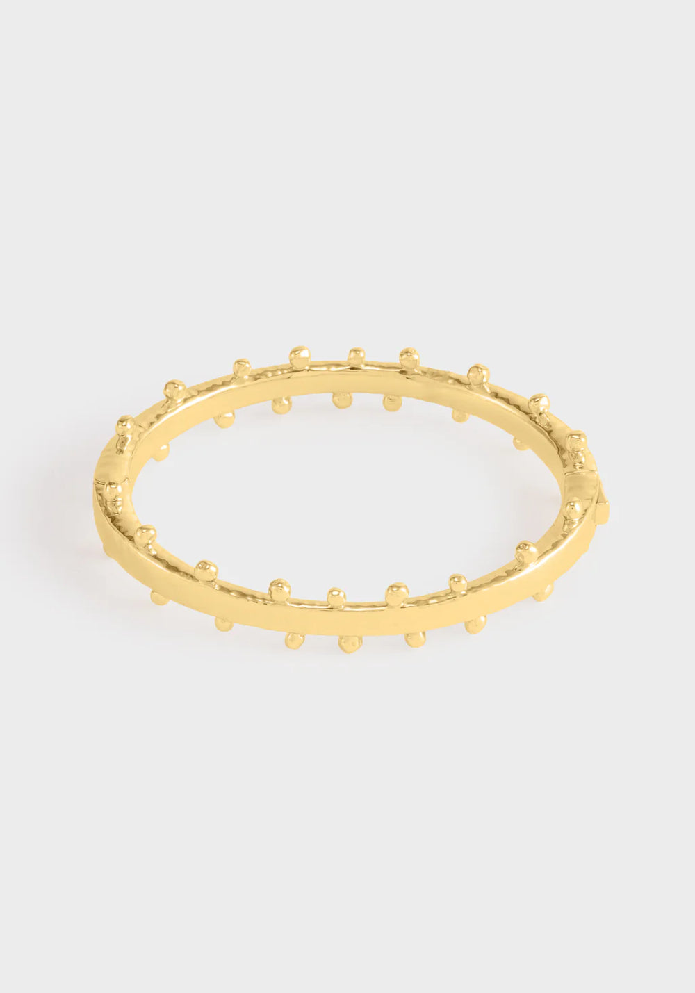 The Milos Hinged Bangle showcases the artisanal beauty of soft hammered gold that captures light like sunbeams dancing on Mediterranean waters, creating a luminous foundation that speaks to coastal craftsmanship traditions. Adorned with our signature molten beads, this elegant hinged design offers both comfort and sophistication, making it the perfect statement piece to complement your Milos collection or wear as a standalone tribute to seaside elegance.