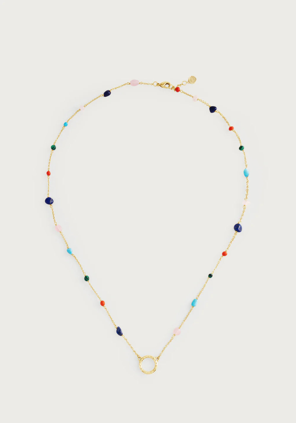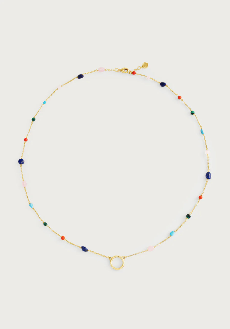 The Milos Long Chain Necklace serves as the perfect foundation for your personalized Milos necklace, featuring lustrous gold plating interspersed with randomly placed natural stones including lapis lazuli, turquoise, rose quartz, malachite, mother of pearl, and coral that create a stunning tapestry of coastal colors. Designed with a convenient ring clasp at the end, this versatile chain allows you to layer and customize multiple charms, building a unique piece that tells your own Mediterranean story with every carefully chosen addition.