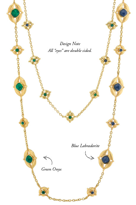 Elegant and endlessly versatile, the Mystic Eye Double-Sided Necklace by Capucine de Wulf features a series of symbolic “eye” motifs in radiant 18k gold over brass, each set with captivating gemstones—one side gleaming with Green Onyx, the other shimmering with Blue Labradorite. At 32" long, this necklace can be worn as a single dramatic strand or doubled for a layered look. The fully reversible design offers two distinct color stories in one piece, making it the perfect accessory to transition effortlessly from day to night.