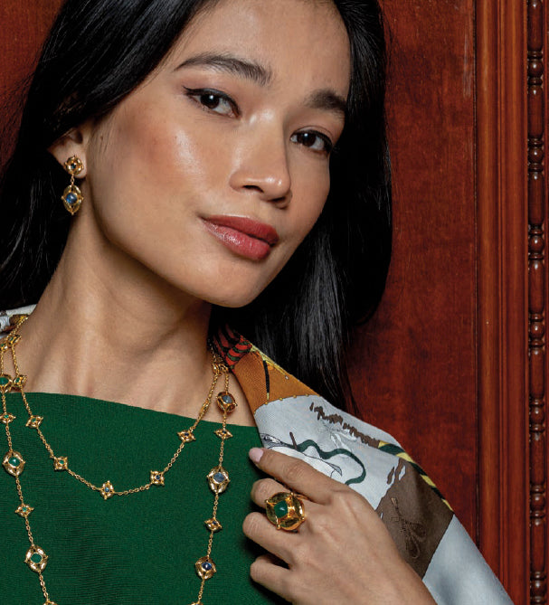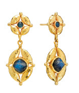 Intriguing and elegant, the Mystic Eye Post Drop Earrings by Capucine de Wulf are a captivating blend of symbolism and style. Crafted in 18k gold over brass, each earring features a diamond-shaped “eye” motif framed by delicate golden leaves, accented with luminous gemstones that catch the light beautifully. The articulated drop design adds graceful movement, making them perfect for both day and evening wear. Timeless yet modern, these earrings bring a touch of mystique and sophistication to any jewelry collection.