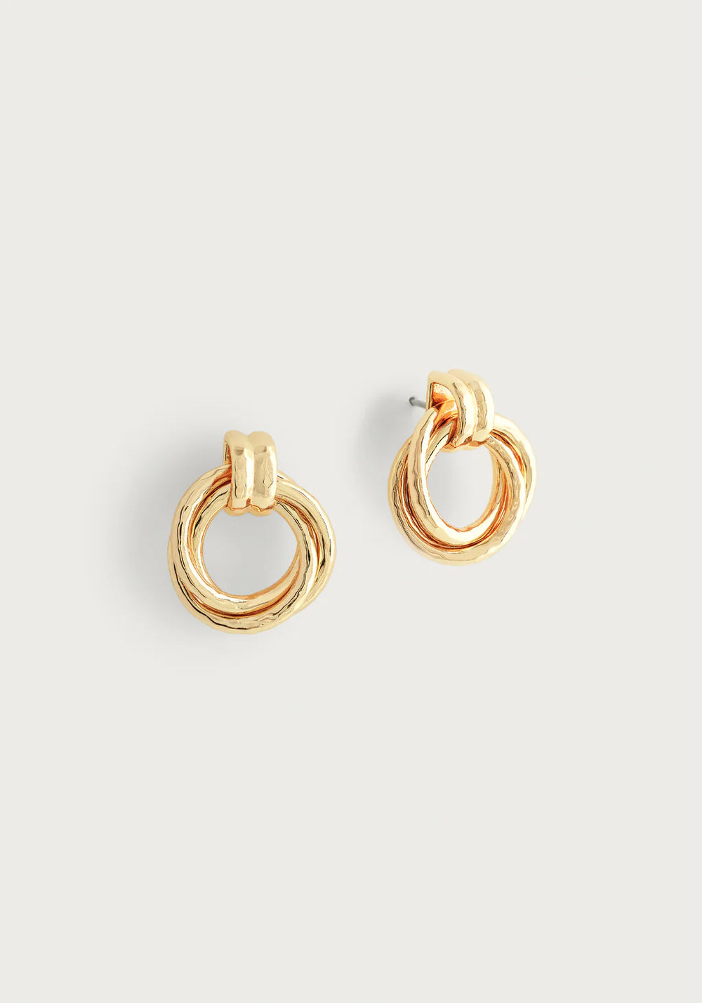 These classic triple ring gold earrings feature three interlocking rings, each crafted from polished, lustrous gold for a timeless and elegant look. The minimalist design offers a sleek, modern aesthetic, with the rings offering a subtle movement and shine. Versatile and refined, these earrings add a sophisticated touch to any outfit, making them perfect for both everyday wear and special occasions.
