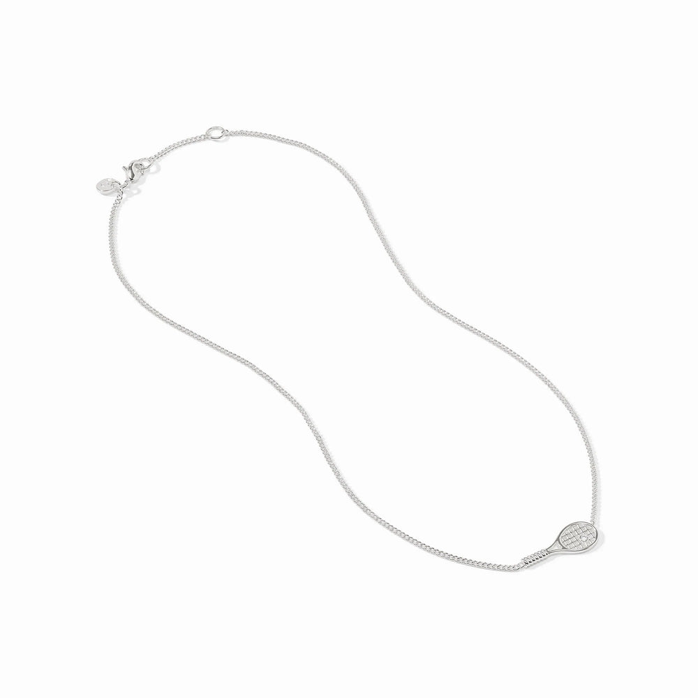 A sculpted silver racquet hitting a sparkling gemstone tennis ball, held by a delicate curb chain.