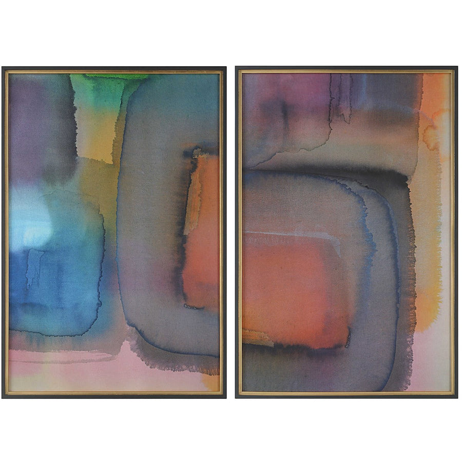 The striking Prismatic Set of 2 delves into the close inspection of watercolors responding to paper. The oversized pieces can be shown individually but when paired as companions, they encompass the full spectrum of the prism. Printed on paper with special matte finish. Framed in a charcoal gray wooden frame with a metallic gold leaf inner lip. May be hung horizontal or vertical. Artwork by Michael Banks.
