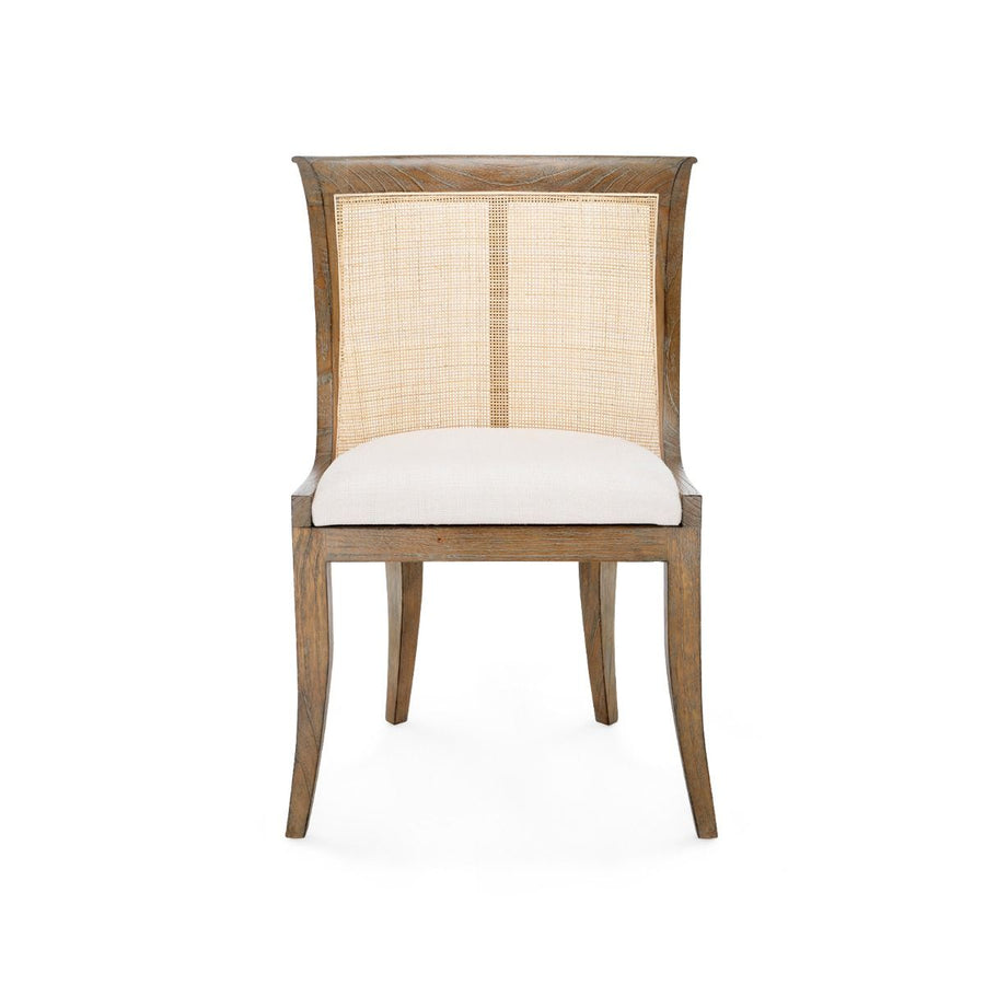 Cape Lilac Mahogany Arm Chair in Driftwood finish. This handsome chair, chosen for its deep grain and ethereal texture of Cape Lilac Mahogany, is a truly special material. Stained in a limed dark gray, natural or driftwood color, the grain of the wood shines. The chair's shape is derived from ancient Klismos chairs of Greece but also has notes of Art Deco influence. The slightly flared, hand-carved legs add a touch of elegance and refinement. The curved back is striking from all angles—and allows the seat to be nestled nicely under any dining table or desk. Each detail of this chair is carefully considered. The back is carved by hand for subtle shaping while the basket weave-patterned caning is hand woven in our factories, strand by strand. The linen drop-in seat is easily reupholstered. The result is comfortable without being overly large and perfectly suitable as a desk chair to work from home or dotted around a curved dining table (as it has no trouble with the apron of a desk or table). What We Love About The Chair: The striking curves of the Grayston and its total versatility continually make it a bestseller.