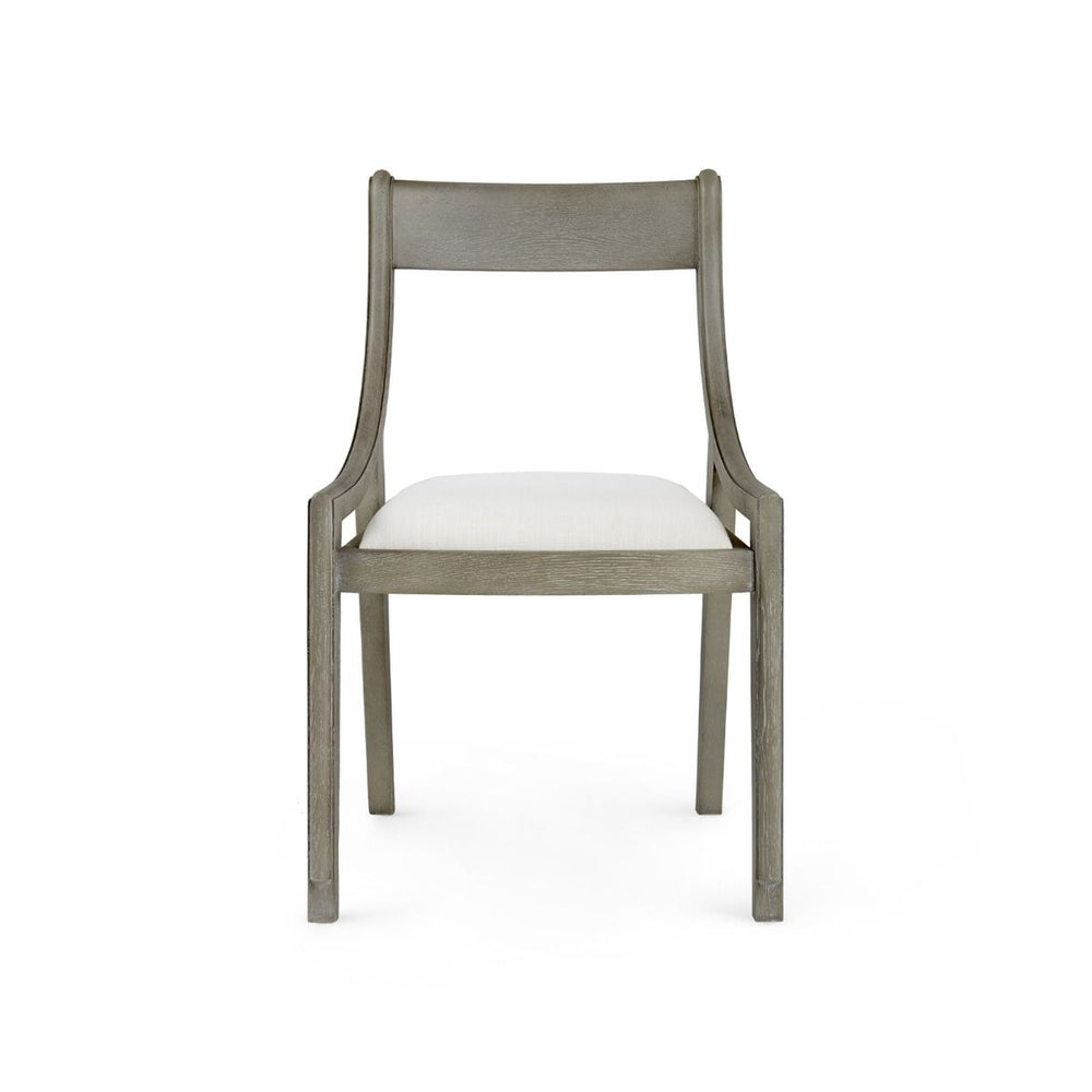 This versitile chair is based on a Greek design, has hand-carved scrolling, a rounded top edge, and a unique swooped silhouette. Produced in cerused oak——the Klimt chair is pared back with little ornamentation. The chair has hand-carved details—like the elegant scrolls that top the chair’s backrest—and a refined design. The front of the chair’s legs top edge is rounded by hand to elevate the overall silhouette. The natural linen drop-in cushion can be easily removed for professional re-upholstery. This chair is multi-functional and extremely comfortable. Its minimal style lends to both modern and traditional decors. The piece could be used as an office chair, a dining chair, a vanity seat or in an entryway.