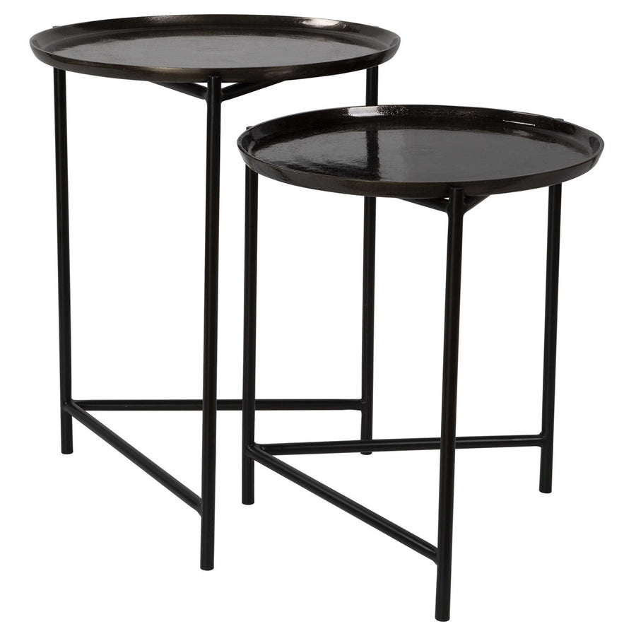 This set of functional nesting tables feature contrasting iron frames in satin black, accented by textured cast aluminum tray tops finished in dark nickel. Sizes: Sm-17x20x17, Lg-19x24x19
