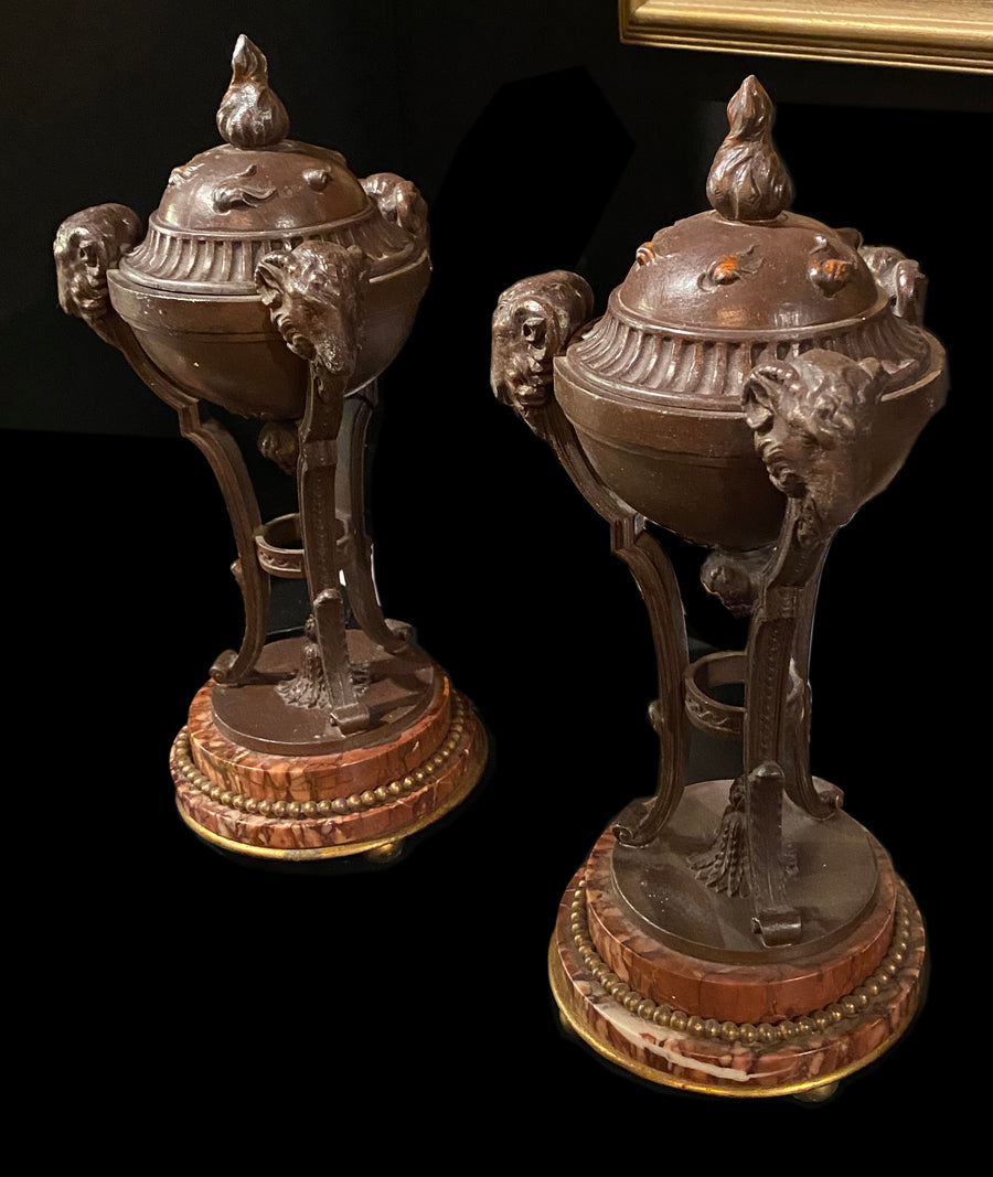 Stunning pair of solid bronze with marble bases Italian Rams head urns. An exquisite example in beautiful condition. The marble is particularly beautiful on these pieces. These two lidded urns on legs, also known as cassolettes, each have spectacular decorative accents. Cassolettes usually flanked a mantle clock, but this wonderful pair would be perfect in a bookcase. c. 1880