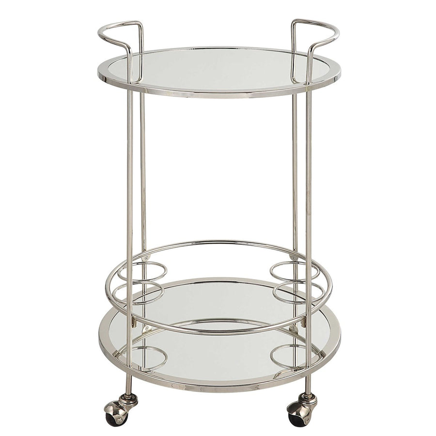 This sleek bar cart rolls wherever the party goes! The metal cart is finished in polished chrome with dual mirrored shelves for optimal storage and display. The petite round frame sits atop rolling casters, enabling easy placement in any living or dining space.