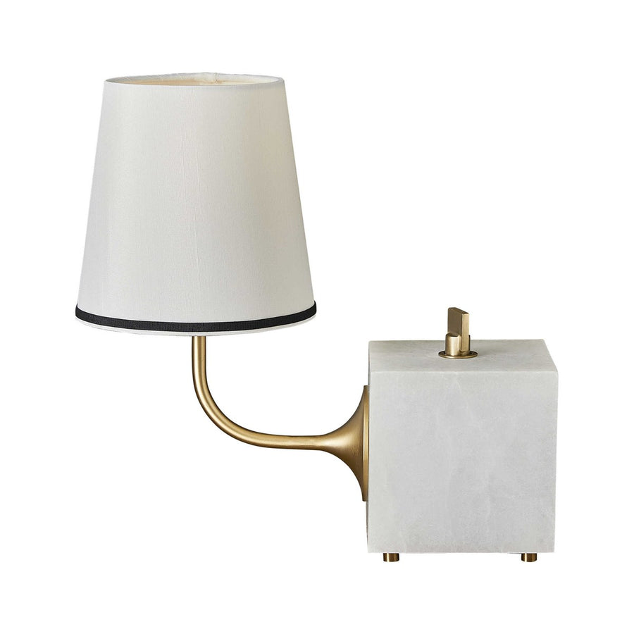 The classic details of this small lamp makes it perfect for locations throughout the home: book shelves, side tables, intimate table for two. The smart, white tapered shade contains a black ribbon trim detail. The goose neck in satin brass finish allows the light to extend into its glow. The white alabaster base cleverly contains a rotary dimmer on top and the four feet allow optimum control of the black twisted fabric cord.