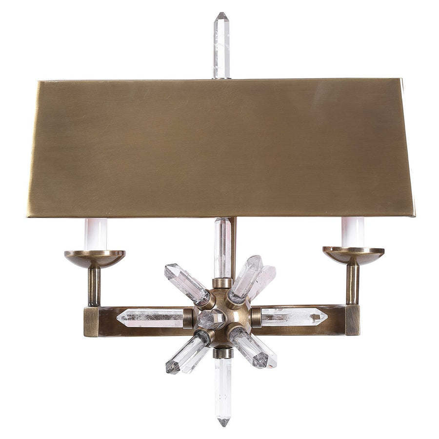 Two candelabra bulbs provide soft light diffused by a stylish metal shade and illuminates starbursts made of rich man made quartz crystals. Subtly and sophisticated designed arms are made of steel with antique brass finish and sit beneath an antique brass shade. 2-60 watt max, candelabra sockets. Bulbs not included.