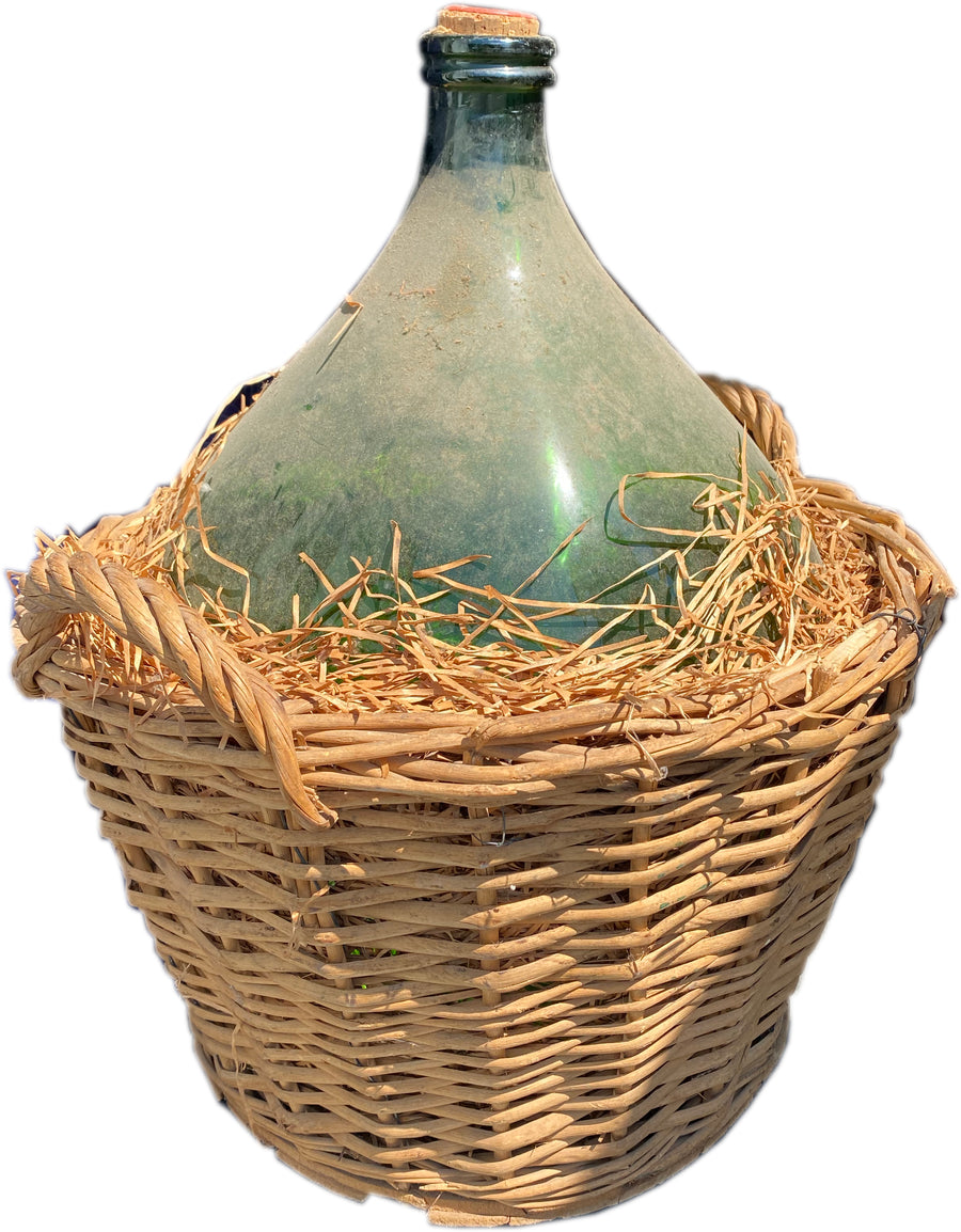 This is a hand blown French country green glass jar with a hand woven basket that surrounds it. This large green glass jug is a vibrant green and has a large opening at the top. The glass jar is surrounded by a handmade French country basket to protect it. This jug and basket was made in France circa 1960.