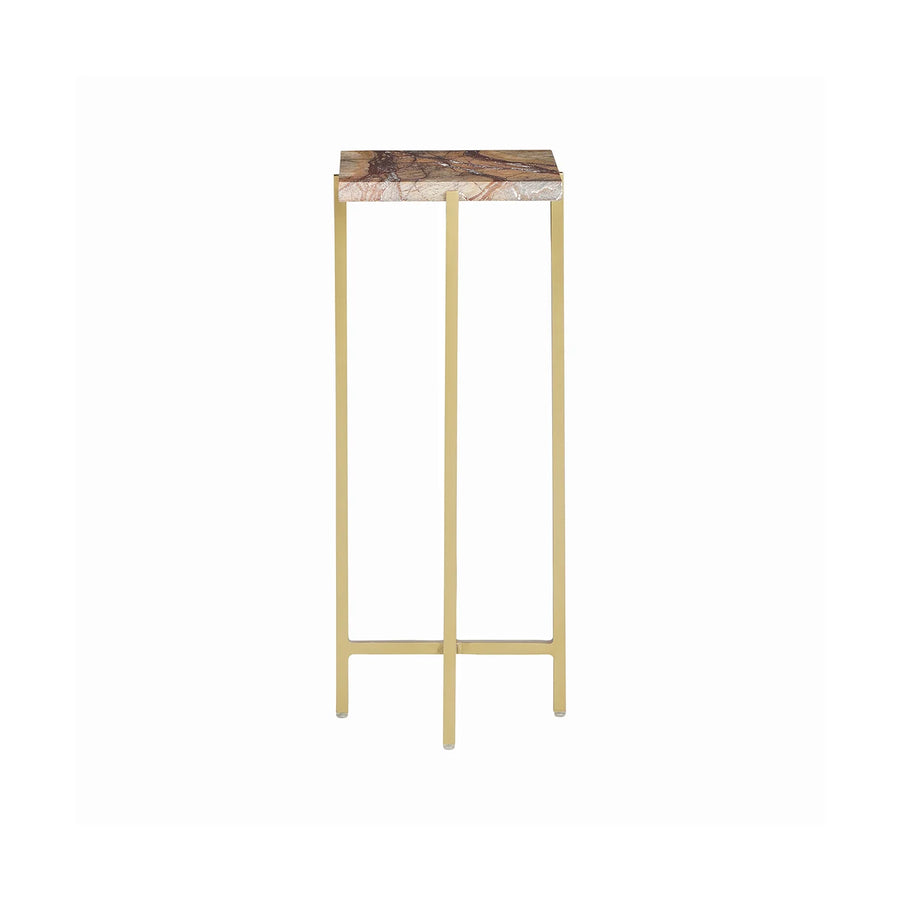 This petite drink table pairs strength and style. The brass-finished iron base includes four legs set at the mid-point of each straight edge of the tabletop. Stands 21 inches tall, and is capped with Bidasar Brown Marble that is antique finished.