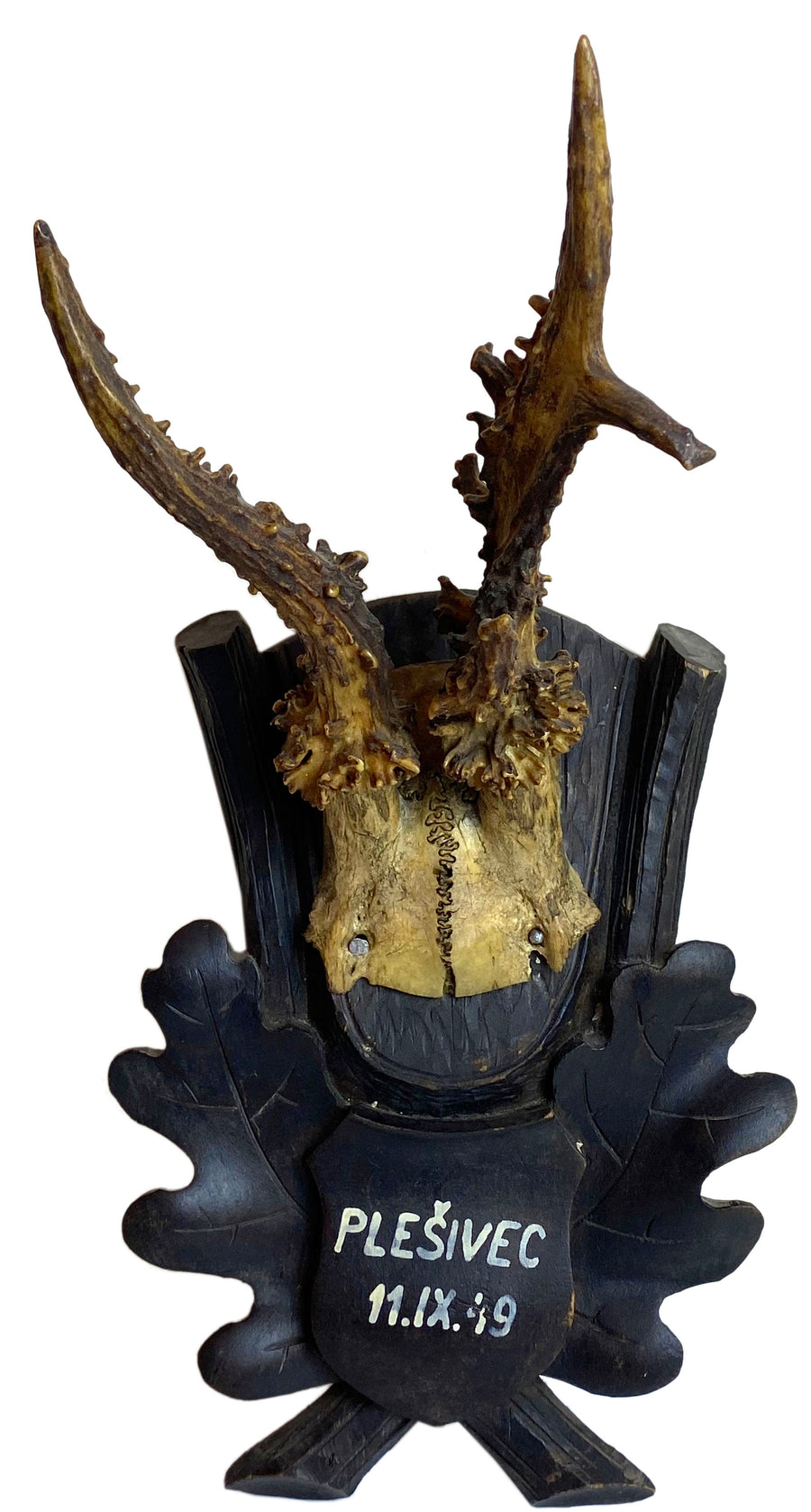 Antique taxidermy from Manhartsbrunn, Austria. Featuring a set of Chamois horns on a small wooden plaque carved with an oak leaf spray with acorns and a shield. You're looking at an extremely rare example of original craftsmanship: A hunting trophy hand-carved and hand-painted from the early 20th century. Antlers and wooden socket are in fine condition.