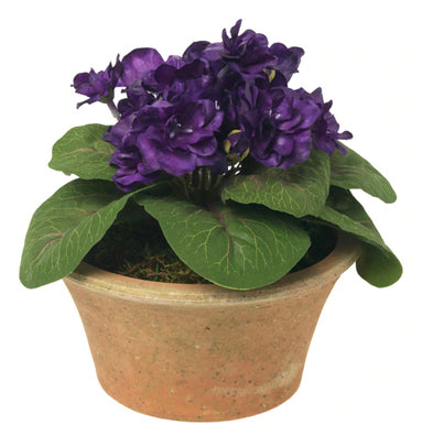 This sweet faux African violet sits in a natural terra cotta pot as if it were planted at a nursery, ready for your enjoyment. Place her on a sunny ledge or use her in a bookcase and you"ll never have to worry about watering her again.