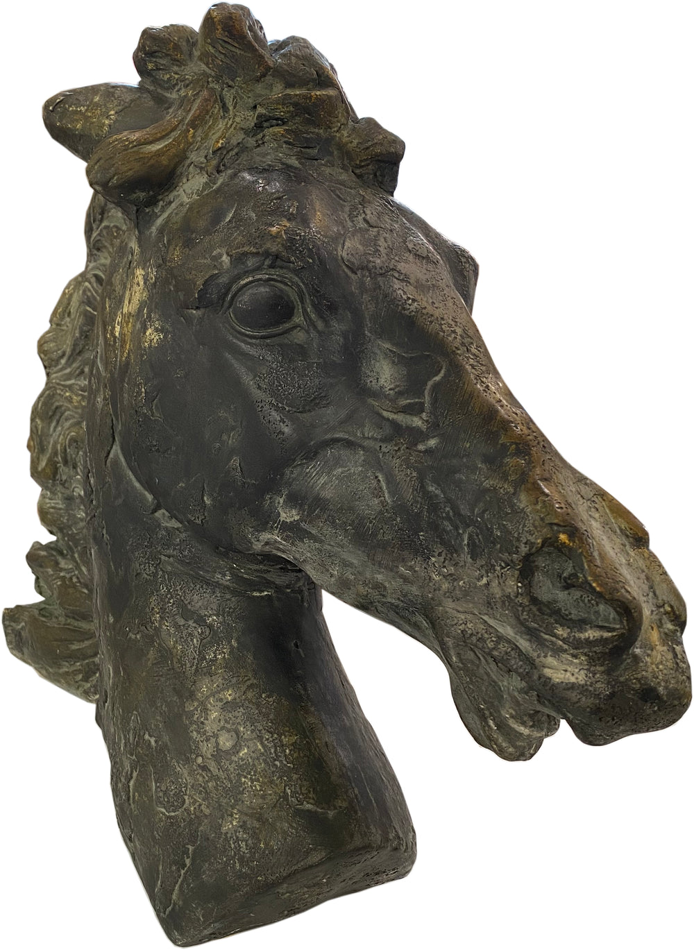 Remarkable bronze horse head statue. The patina is extraordinary and the details are incredible.