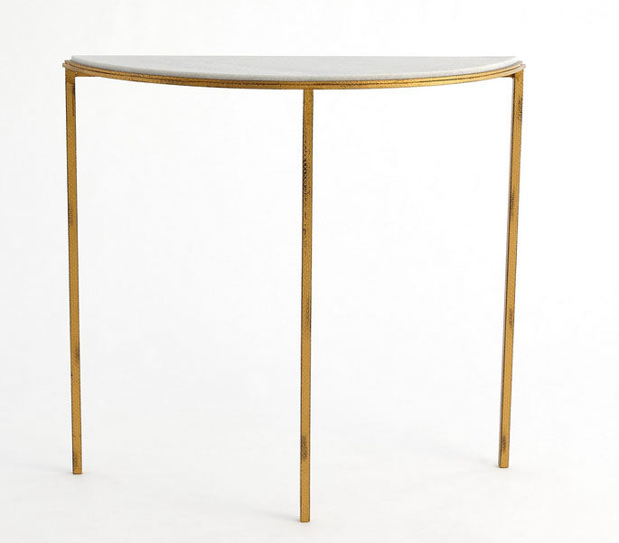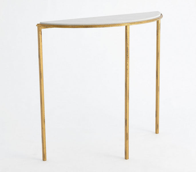 A warm golden frame with luxe hammered texture contrasts gorgeously with cool, creamy white marble. This console is makes an elegant statement in any room.