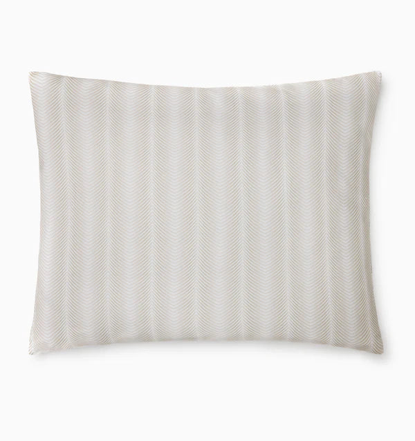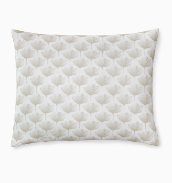 Printed on Italian-woven long-staple cotton, in two striking colorways, Edna is an ode to vivid extravagance. The reversible design offers two distinct expressions of artistry. On one side, a repeat Ginkgo leaf pattern, symbolizing beauty and enduring quality with its graceful form. On the other, a minimalist art deco texture unfolds, kaleidoscopic in its mesmerizing symmetry.
