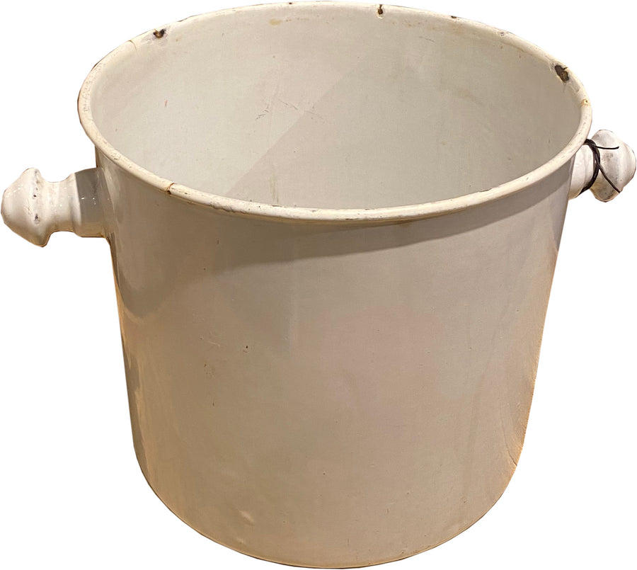 Vintage French enamel confiture pot with handles. French white ironstone pot with handles on the sides. This is a very unusual pot with a beautiful patina.