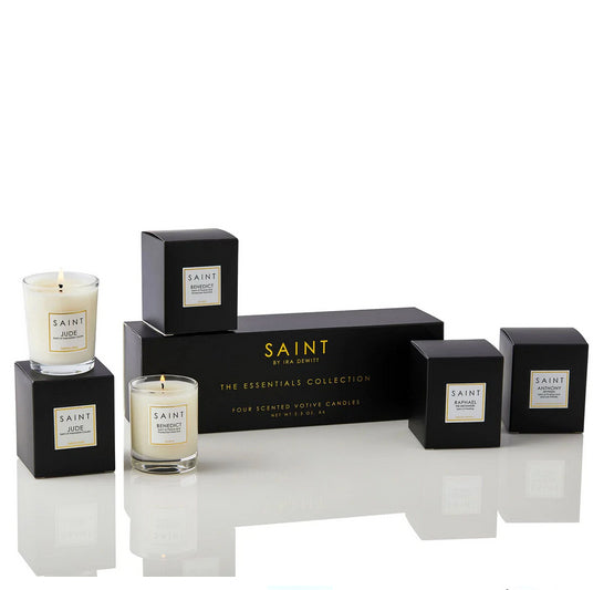 Transform any atmosphere with this set of four miniature SAINT Candles. A $100 value, this curated collection of bestsellers contains individualized fragrances with holy intentions. Whether someone is battling a health issue, seeking peace, or trying to find love, there is a patron saint — and a SAINT Candle — to help them on their journey. Each votive candle contains holy oil as part of the wax and is accompanied by a blessed prayer coin.