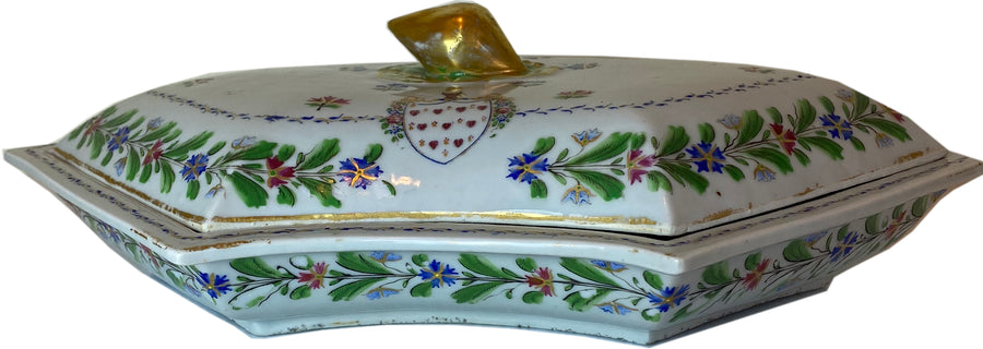 Antique early 19th century English sprig porcelain covered bowl. Decorated with floral sprig of cornflower and roses enhanced by bright gilding and a coat of arms with a woman. Hand-painted inside and outside. C. 1830