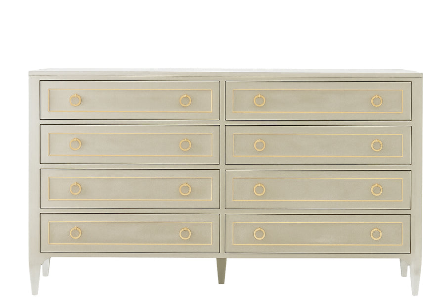 The Gustavian Dresser from Modern History blends timeless elegance with practical function. Handcrafted with refined Gustavian-inspired lines, this dresser features eight spacious drawers accented with gold leaf detailing and hardware. The soft gray-toned finish is highlighted with subtle gilded accents, giving the piece a sophisticated, luminous presence.