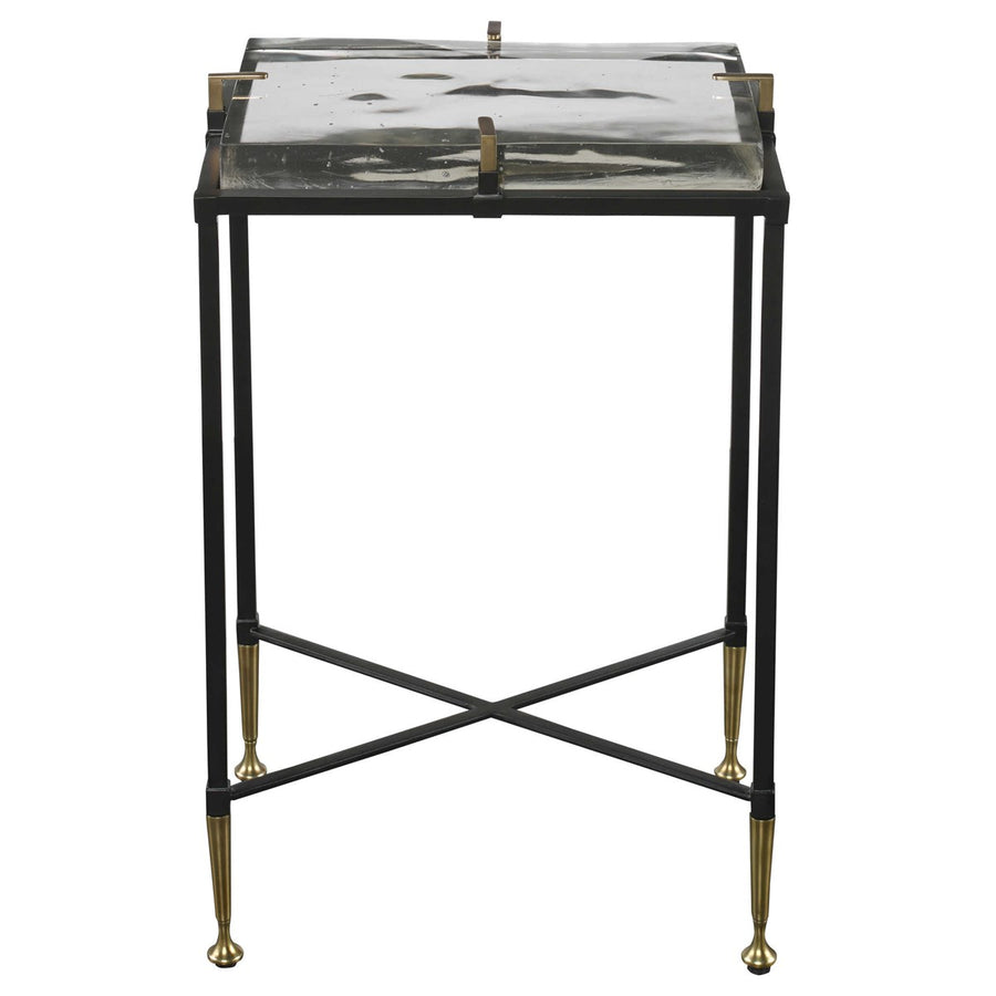 The Ice Block Table has an impressive 1 1/2" thick seeded glass top held in place with four solid brass clips. Made of solid iron with a black finish, featuring beautiful solid brass feet, all lending itself to a found antique treasure. It is the perfect chair side table that will blend well into any style room. With the use of recycled glass, each piece will be unique and may have slight imperfections.