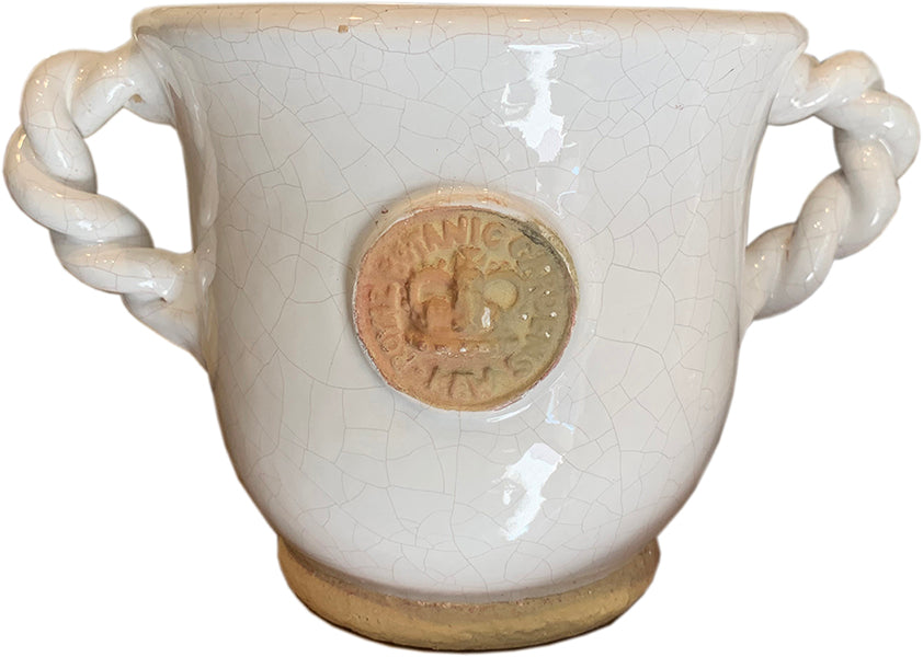 Authentic English inspired Kew twisted handled pot with the official seal of the Royal Botanical Gardens, Kew. The braided twisted handles are unique and set this piece apart from the rest. These pots are entirely handcrafted by Artisans, they are suitable for indoor use or outdoor use although we advise bringing them indoors during particularly frosty periods as they can crack. With each purchase of these beautiful pieces, funds are contributed to the gardens and its important, on-going work. Each item is individually crafted and therefore no two items are identical and minor imperfections are inherent and add to the beauty of these products. This is a customer favorite, they sell fast and colors come and go in the blink of an eye.