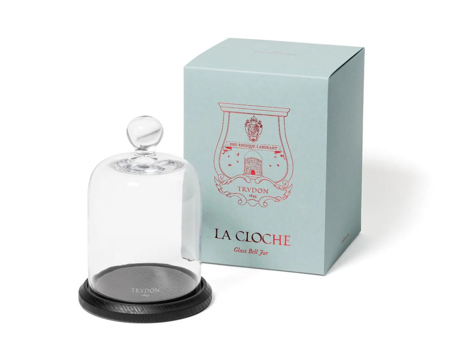 Throughout the 20th century, the wedding cloche progressively lost its symbolic function in the home and entered into the realm of a collectible or interior decoration. Since the opening of its boutique in Paris, Trudon has utilized these traditional glass bells to display candles. These cloches have become part of an important house ritual, as they are carefully lifted to reveal the candle’s exceptional scents. Today, Trudon makes these glass bells available to allow admirers of the brand to glorify their candles in their own interiors. The blown glass dome is decorated with the Trudon logo and paired with a handcrafted and polished wooden base. Connected to the storied history of Trudon, this luxurious object protects the candle and concentrates its perfume. La Cloche is perfect for the classic candle but the small candle fits also.