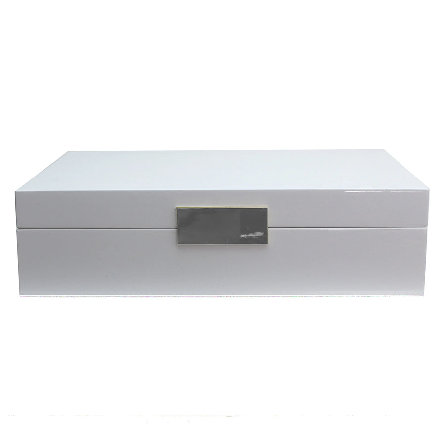 This stunning high gloss jewelery box measures approximately 8 x 10.75 inches with an internal size of 24.5cm x 17.5cm for the large size. The smaller beautiful lacquered pale denim jewellery box measures 4x9 inches and features a silver plated clasp and matching hinges.