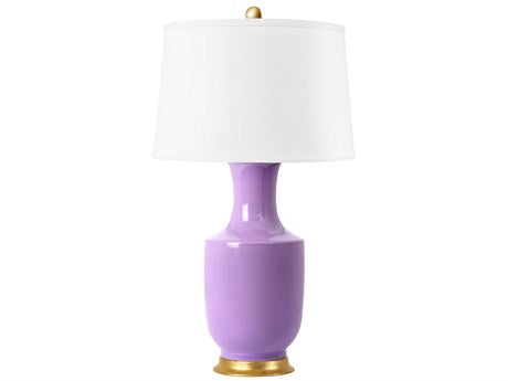 This lamp embraces classic luxury with a bit of whimsy thanks to its fresh pastel coloring, softening even the most traditional of decor schemes with a dash of springtime charm. Its silhouette is inspired by Chinese pottery, featuring a long, elegant neck which slopes down to meet its full-bodied lower half. The lamp's graceful curves come to life in gorgeous, glazed porcelain and finished with a glossy sheen that plays up its light lilac hue. Its simplified shape, which nods to the rotating vases that originated in the Qianlong Dynasty, reflects more modern tastes while a gold-leafed base and finial provide a treasure-like richness akin to an antique. Pair a set across two nightstands or on either end of a long console. This lamp is topped with a crisp white laminated linen shade, accented with brass hardware.