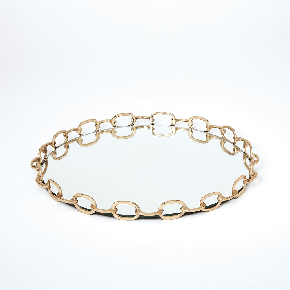 With a mirrored base, the Linked Mirrored trays make a bold statement anywhere in the home. The mirrored base is wrapped with nickel or brass-plated brass links have felt tabs to keep your table tops protected.