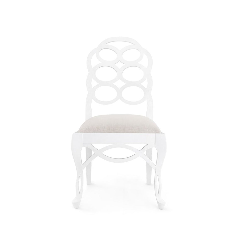 Good taste never goes out of style. Case in point: the Loop Side Chair, an elegant seat based on the iconic design of Frances Adler Elkins, one of the most prominent female furniture designers of the 20th century. Elkins introduced the Loop Chair in the 1930s, and only created eight in total. But the beloved silhouette, replete with graceful wood-cut details and looping fretwork, has remained a high-society staple, perfect for palatial Palm Beach dining rooms, breezy seaside cottages, and decor schemes ranging from Chinoiserie to classic Americana. Here our artisans have recreated the chair in white lacquered mahogany with a comfortable drop-in cushion. A true conversation piece around a dining table.