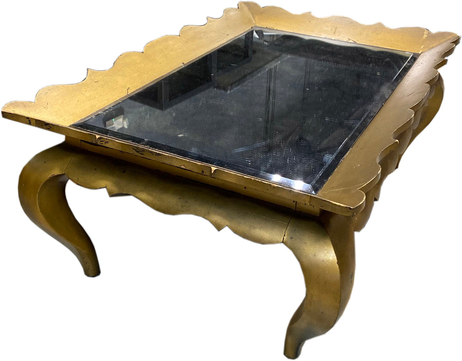 Vintage mid-century gilded coffee table with smoky mirrored top. This coffee table is hand carved and hand-finished. The gold is distressed and the patina adds to the beauty and originality.