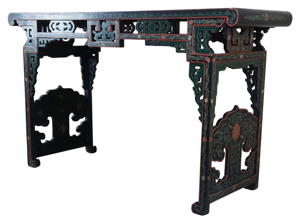 Vintage Jinlong Ming style altar console table featuring reticulated accents with a floral rose bamboo and bird scene with black lacquered field and vibrant greens and reds.