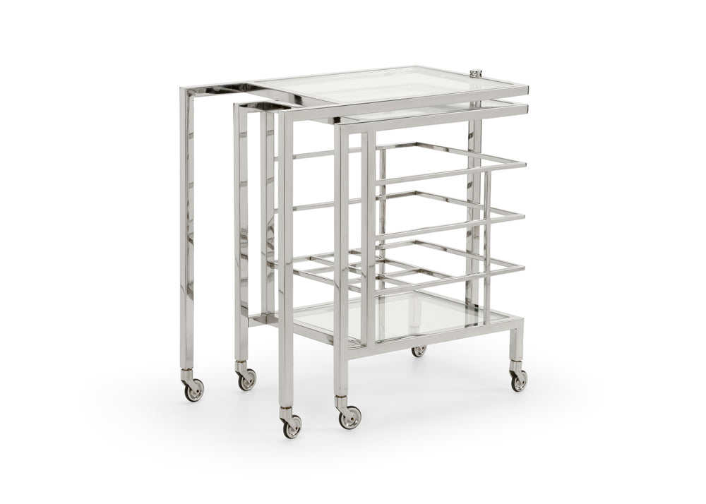 Elevate your entertaining with this striking bar cart, crafted from polished brass-finished metal and designed for both style and function. Featuring a smooth swivel-open design, this cart expands to reveal an extended surface for effortless serving.
