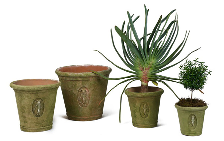 Our friend, Dimitri, is a charming yet elusive character who generally dwells somewhere at the edge of the garden and the Wild Wood. He’s rarely seen – usually at dusk if one is lucky. However, after imbibing far too much wine, he allowed that we might affix his image on some of our aged terra cotta planters. Hence, Campo’s new offerings. Dimitri is an odd fellow, but then again, so are we.