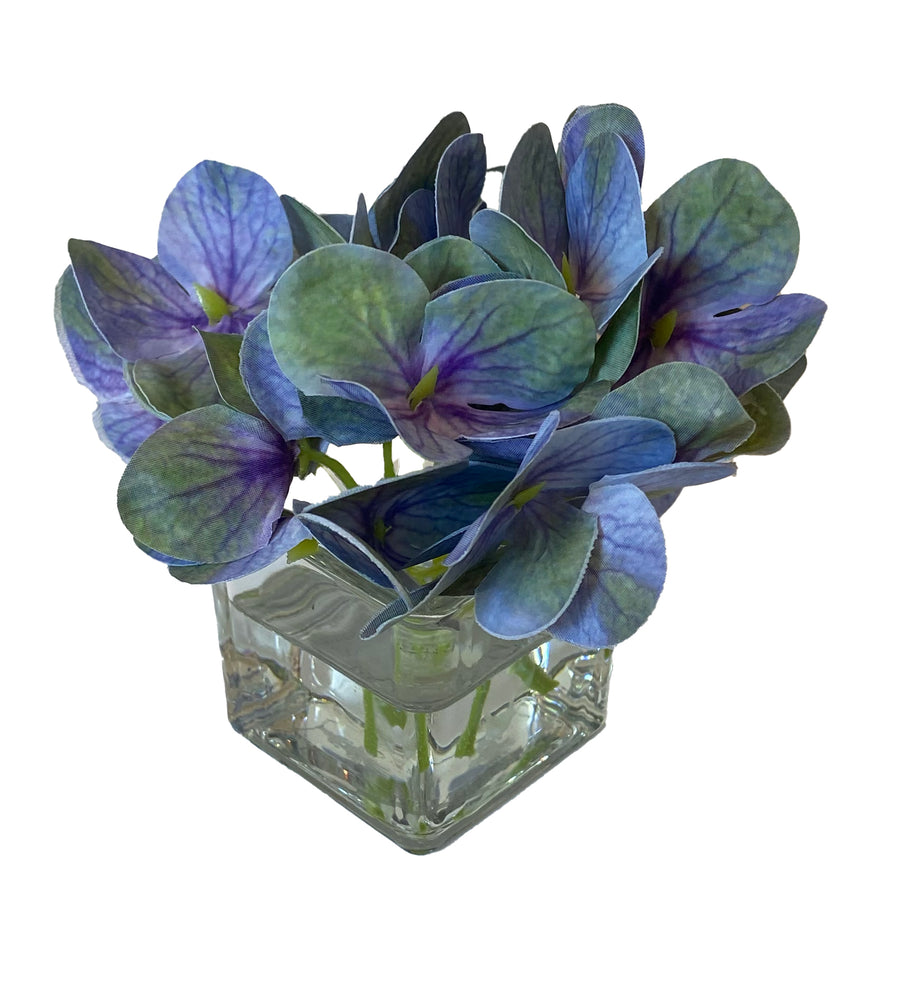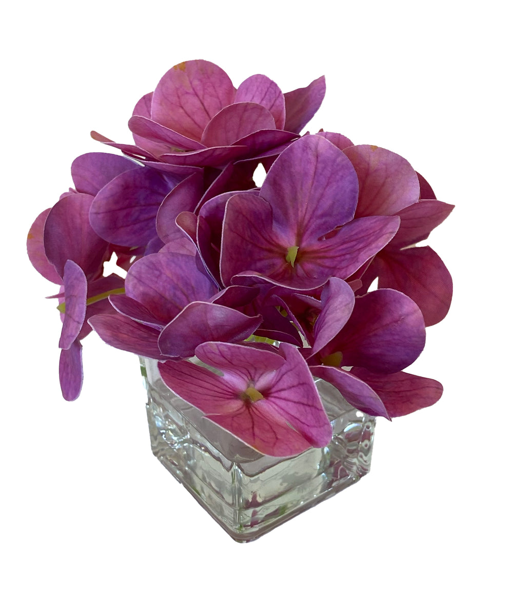 Add a touch of effortless elegance to any space with these lifelike silk hydrangea blooms, artfully arranged in a petite 2" glass cube. Available in vibrant blue or hot pink, each piece captures the beauty of fresh-cut flowers without the maintenance.