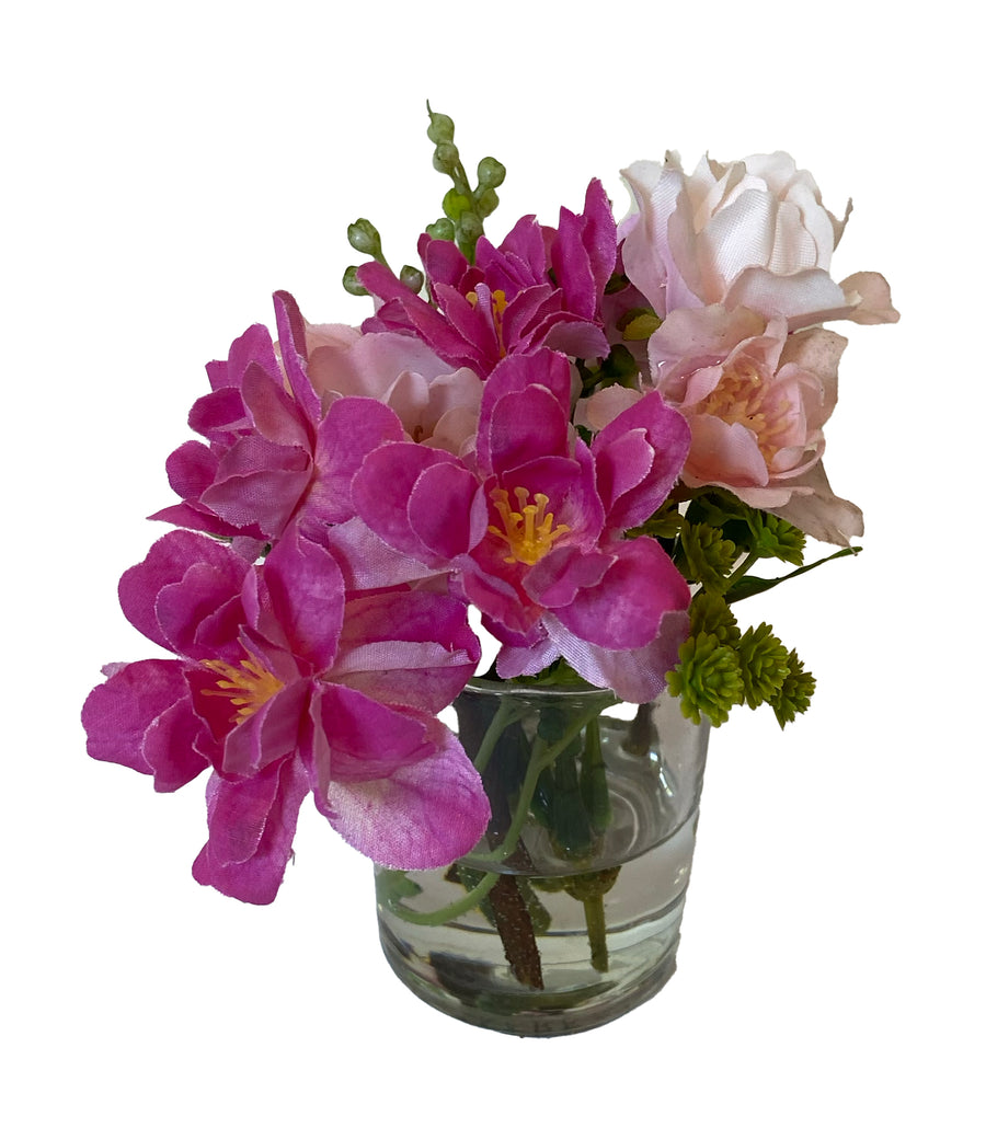 A charming blend of vivid magenta blossoms and soft blush silk roses, this petite arrangement is artfully set in a 2" round glass vase with realistic faux water. Its vibrant yet delicate color palette brings a cheerful pop to any space while maintaining an air of timeless elegance.