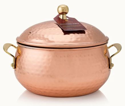 Thymes Simmered Cider Copper Candle Pot is reminiscent of a simmering pot of your favorite holiday drink, this beautiful statement multi-wick candle stuns with copper and gold accents. Warm any room with notes of apples, crushed cardamom and clove and hints of bourbon & malted rum for a rich, spicy scent that's steeped in tradition. Once burned through, this food-grade piece is great for reuse!