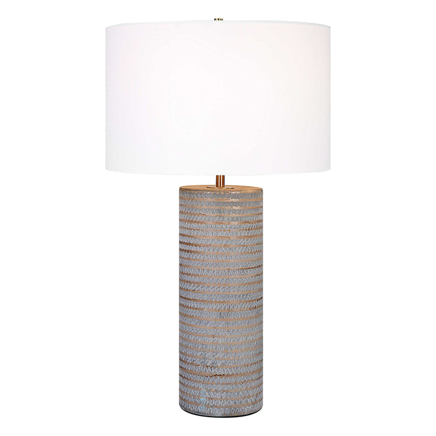 This ceramic table lamp showcases a rustic chiseled texture with frosted pewter gray undertones and organic carved accents in light sepia tones. Iron details are finished in antique brass. The lamp is complimented by a white fabric drum shade.