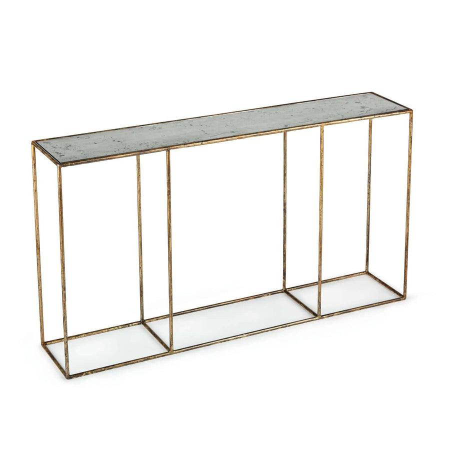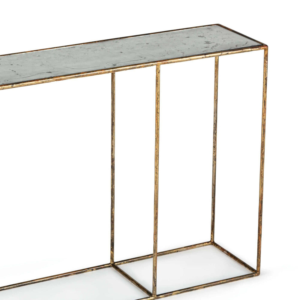 Crafted in Detroit, Michigan, the Smoke console is a classic piece of accent furniture with a subtle edgy appeal. Its delicate-looking gold steel frame suspends an antique mirrored table top that has a hand-applied patina, which gives this table its signature textural appearance.