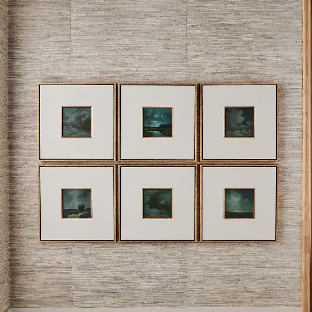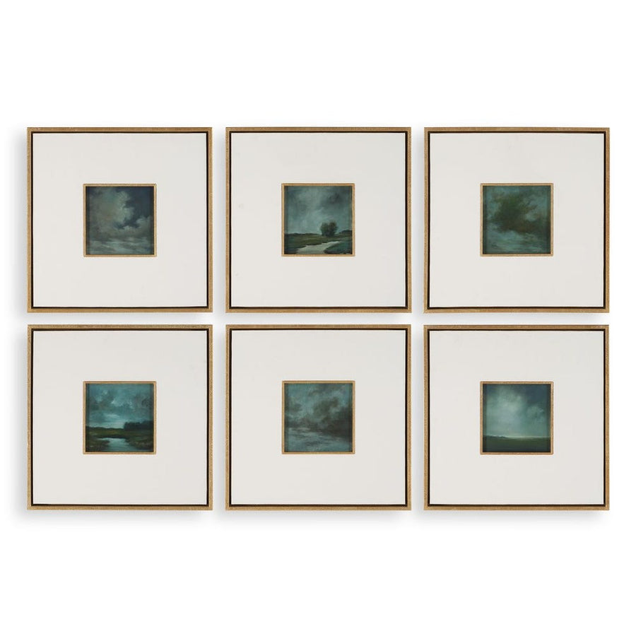 Julie Houck, a Contemporary Landscape Artist residing in both Maui and Maine, transitioned from a professional location photographer to a full-time fine art painter. Houck works in oils and encaustics and her classical atelier training honed her technique of painting in numerous transparent layers in order to recreate the subtle interplay of light in her work. "Evening Cumulation" is the second set in the Cumulation series, depicting clouds and landscapes in the evening light. This set of six canvases is available exclusively at Revelation. Each piece is framed with a carved golden surround, a 6.5" white linen matte, then a floating box frame in an antique gold leaf finish that replicates the carved surround.