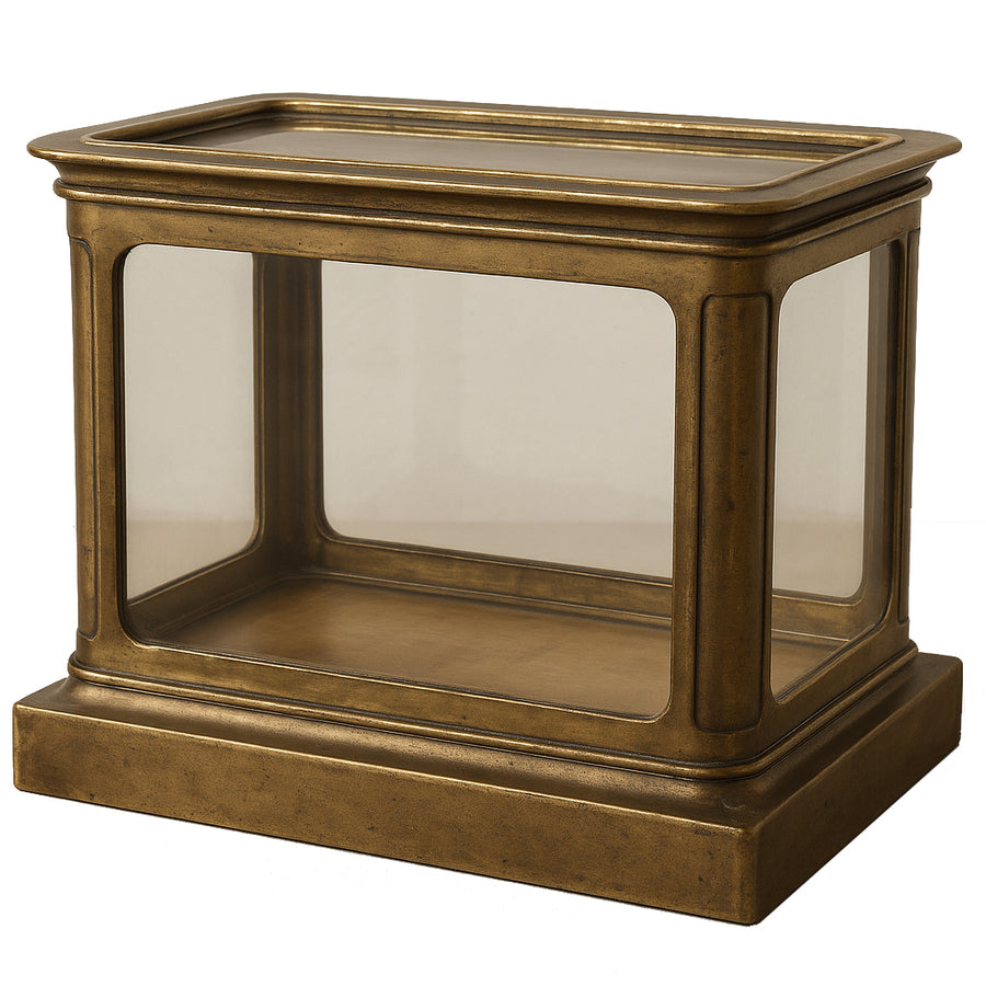 A striking addition to a console, bookshelf, or countertop, this vitrine is perfect for showcasing treasured objects, heirloom jewelry, or seasonal décor. The aged patina of the brass adds warmth and character, making it a timeless display piece in any home.