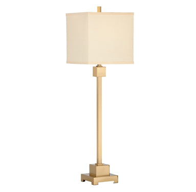 This simple yet stylish buffet lamp is ideal for any decorative style. Crafted of iron with a warm brushed brass finish this 35" buffet lamp has a square base and cubes on each end of a simple column. Continuing with the clean lines, a square egg silkette shade has been added to complete the design. May be paired on a console or buffet to enhance your style.