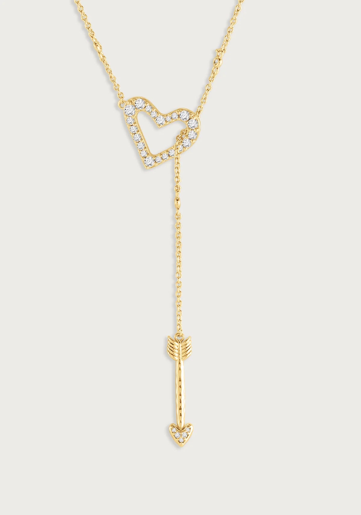 Delicate with a touch of drama, this heart lariat necklace by Anabel Aram is designed to flatter with graceful movement and sparkle. Featuring an open heart accented with pavé crystals and a slender drop ending in an arrow-inspired detail, it creates a beautifully elongated silhouette at the neckline.