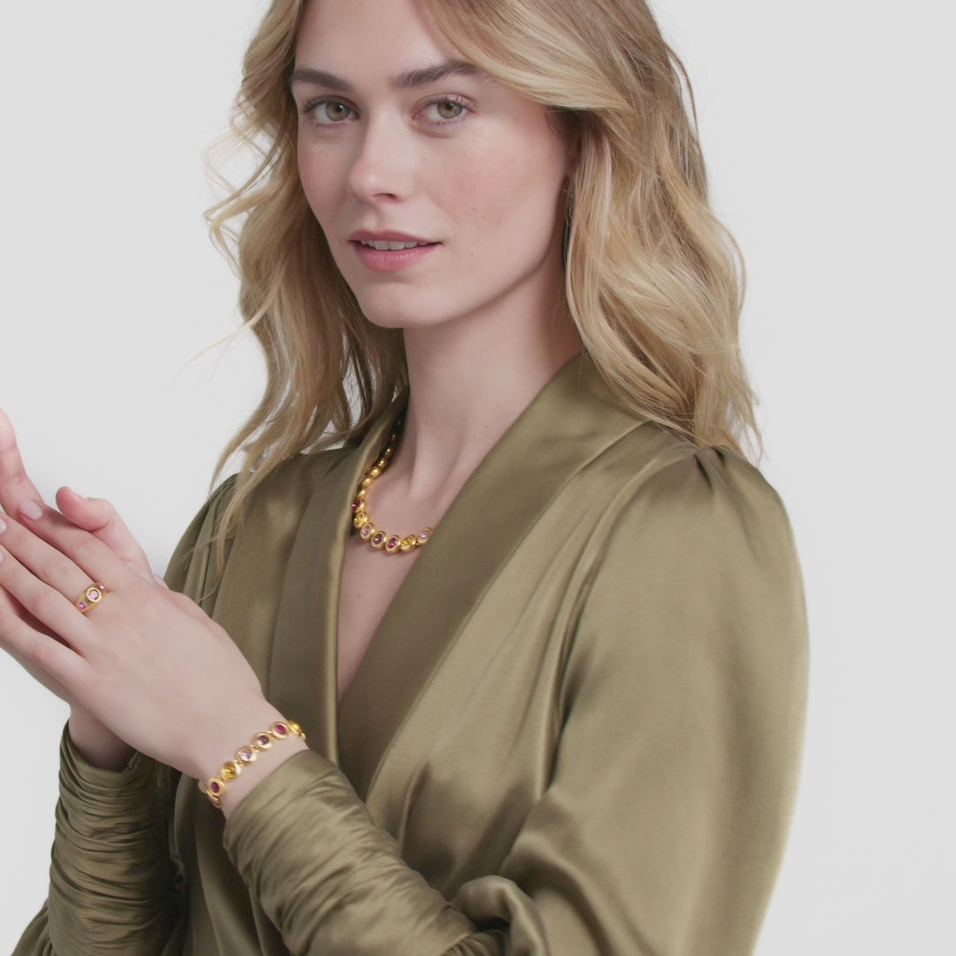 Radiant and refined, this sparkling necklace wraps the neckline in a continuous circle of softly hued brilliance. Faceted imported glass stones in luminous Pink Dawn shades are bezel-set in Julie Vos’s signature 24K gold plate, creating a modern take on the classic tennis silhouette.