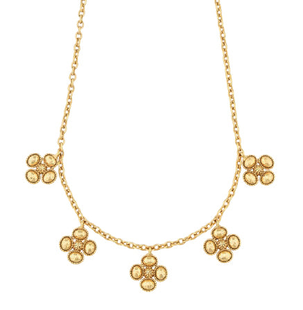 Delicate yet distinctive, the Berry Clover Station Necklace by Capucine de Wulf features a graceful chain adorned with five golden clover stations, each crafted with intricate beaded texture for added dimension and charm. Finished in radiant 18k gold over brass, this 16" necklace includes a 2" extender for a perfect fit. Its timeless design layers beautifully with other pieces or stands out as a refined statement on its own, making it a versatile addition to your jewelry collection.