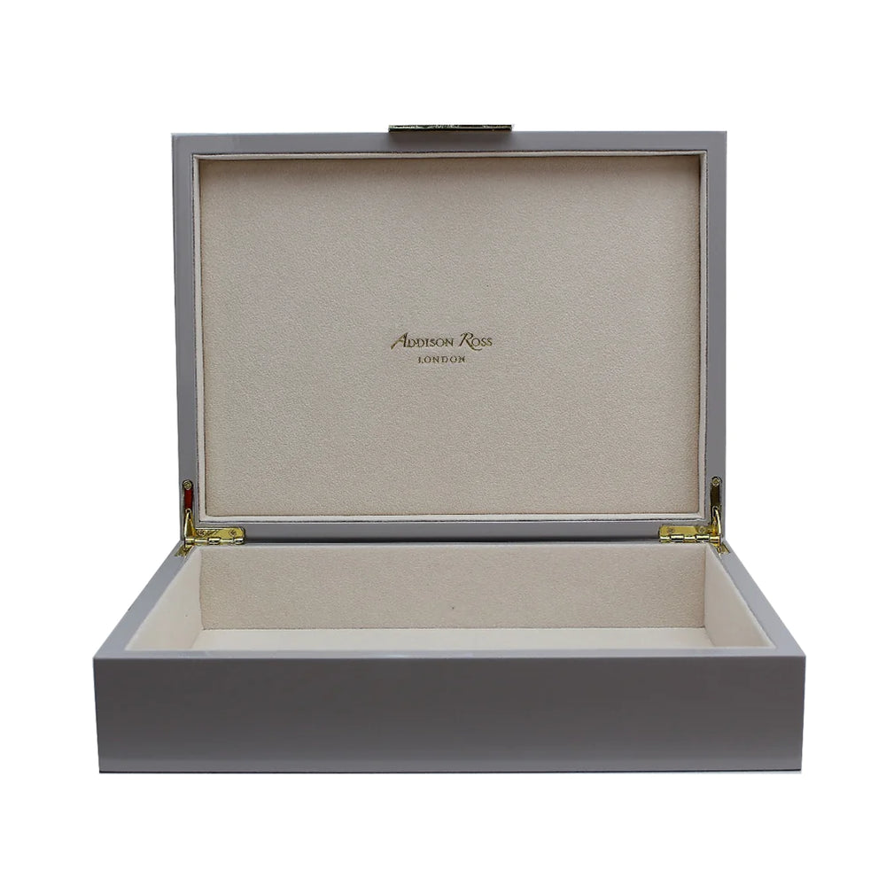 This stunning high gloss Chiffon Grey measures approximately 8 x 10.75 inches with an internal size of 24.5cm x 17.5cm x 5.5cm including depth of the lid.