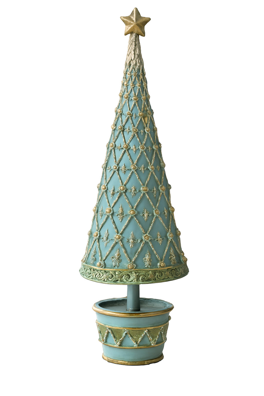 Elevate your holiday décor with this elegant 7" decorative tree, richly detailed in a soft blue finish with intricate gold accents. Perched in a matching pedestal-style pot and topped with a golden star, the cone-shaped tree features a diamond lattice pattern adorned with delicate flourishes and beading.