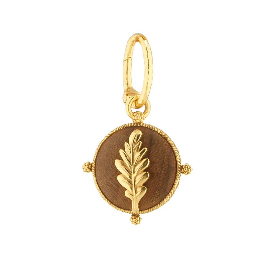 Inspired by walks in the forest, this enchanting oak leaf pendant is crafted of natural teak wood and embellished with golden details, reminiscent of the burnished glow of autumn. This charm can be worn with either the gold or teak side facing front and works beautifully on any chain, so you can keep Mother Nature close—and be reminded that you can be both resplendent and grounded at the same time, as all goddesses are.